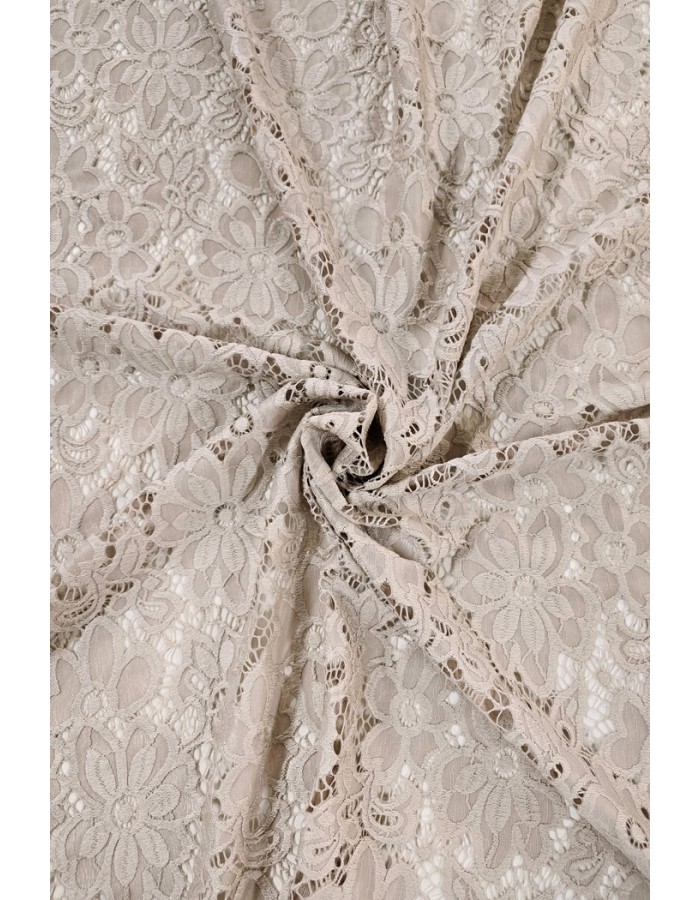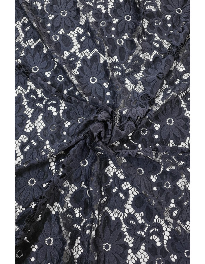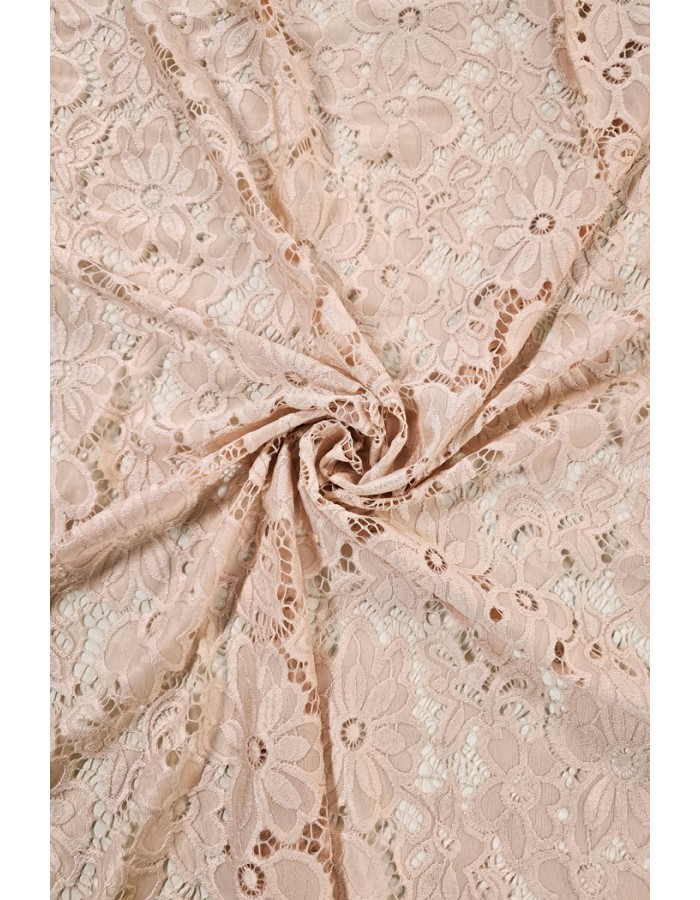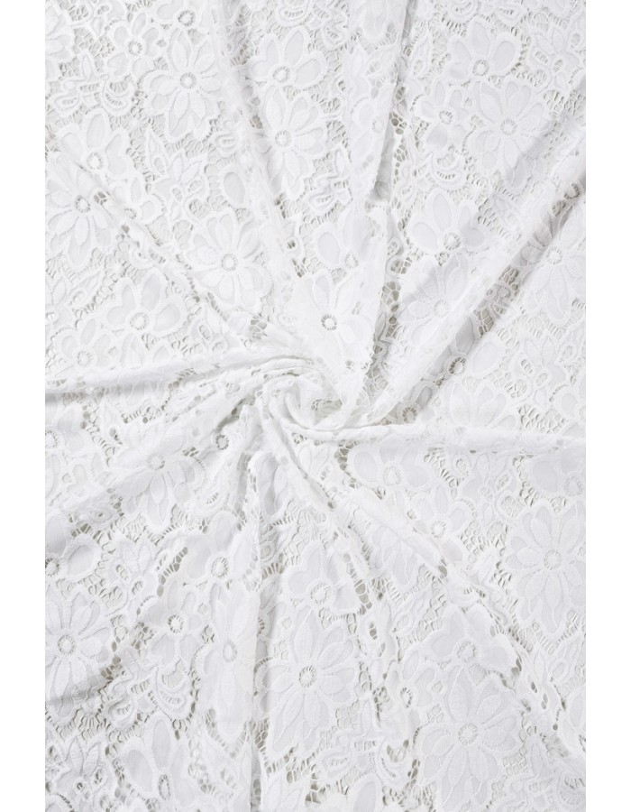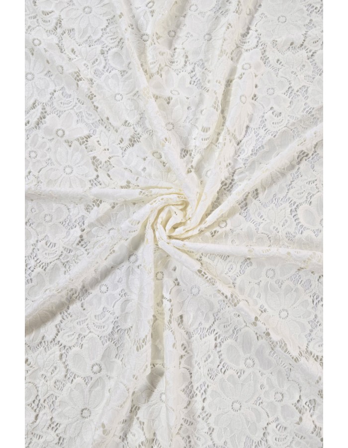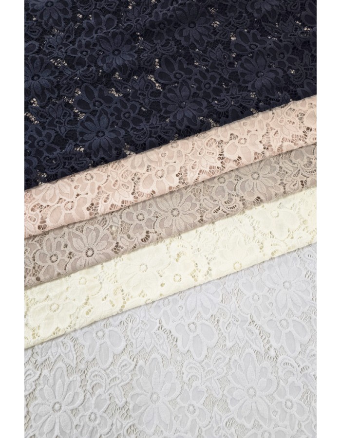 Brodeeratunomainen kaunis pitsikangas, joka joustaa loimen suuntaan ja soveltuu hyvin erilaisten vaatteiden ja asujen valmistukseen.