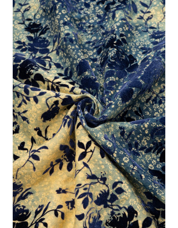 Ohuehko pikkukukkapainettu farkun tyylinen kangas, jonka pinnassa on flokkipainettua samettipintaista kukkaköynnöskuviointia. Sopii hyvin monipuoliseen vaatetus- ja asustekäyttöön sekä yksityiskohtien viimeistelyyn.