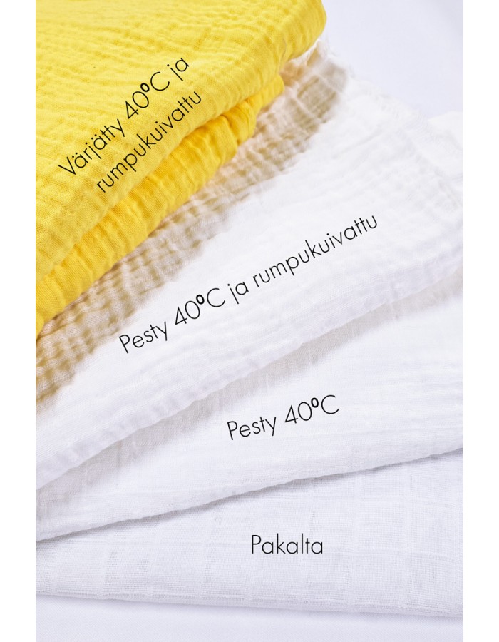 Värien kuvissa alimmainen kangas on sileää pakalta otettua kangasta, keskimmäinen kangas on pesty 40ºC ja päällimmäinen kangas on lisäksi rumpukuivattu.