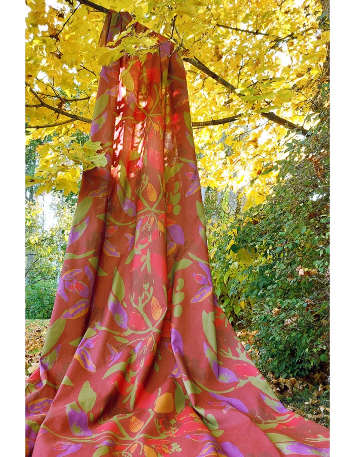 Syyspuutarha on Merja Palinin suunnittelema kuosi, jonka värit hehkuvat upeasti puuvillalle painettuna. Todella monipuolinen kangas, joka sopii mm. verhoihin, kangaskasseihin, essuihin, koristetyynyihin, patakintaisiin ja moneen muuhun käyttöön.