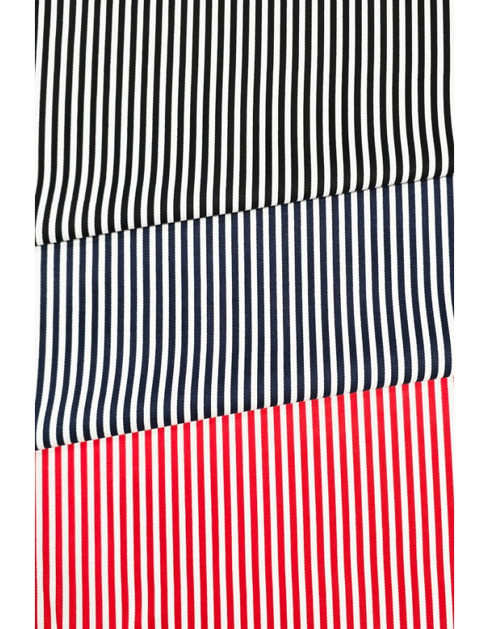 Valkopohjainen puuvillatwill, jolle on painettu 4mm leveää raitaa. Monipuolinen yleiskangas sekä vaate- että sisustustekstiilien valmistukseen.
