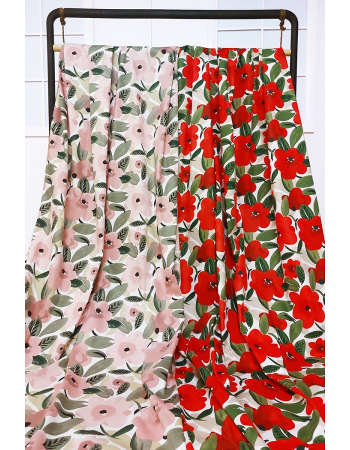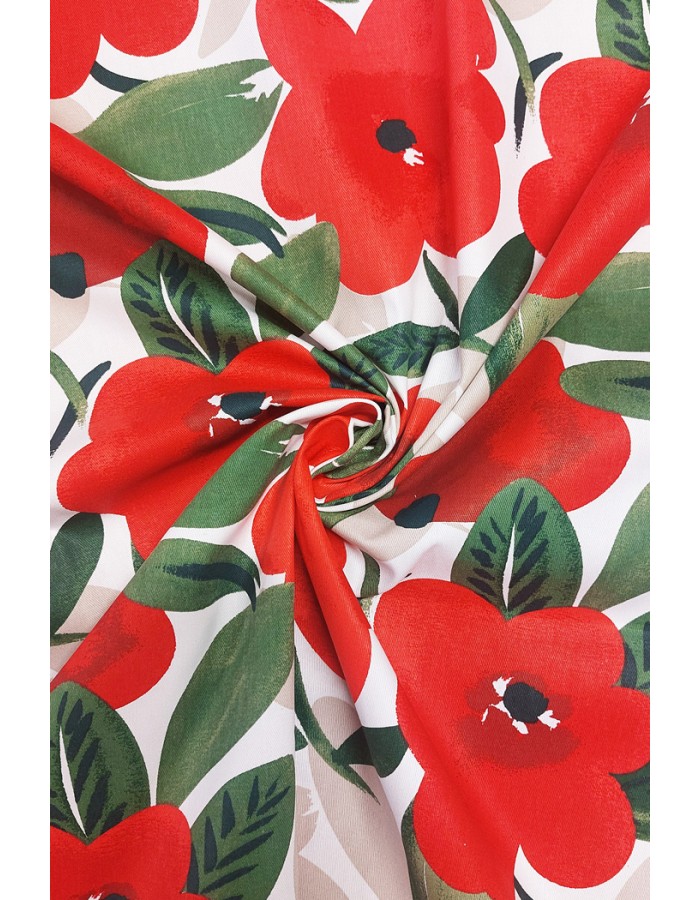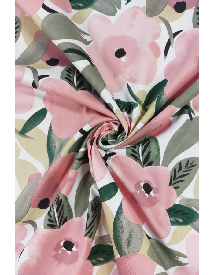 Valkopohjainen, kukallinen ja hieman ryhdikäs twillsidoksinen puuvillakangas sopii hyvin mm. kodintekstiileihin, kangaskasseihin, essuihin tai vaikkapa taustakankaaksi.
