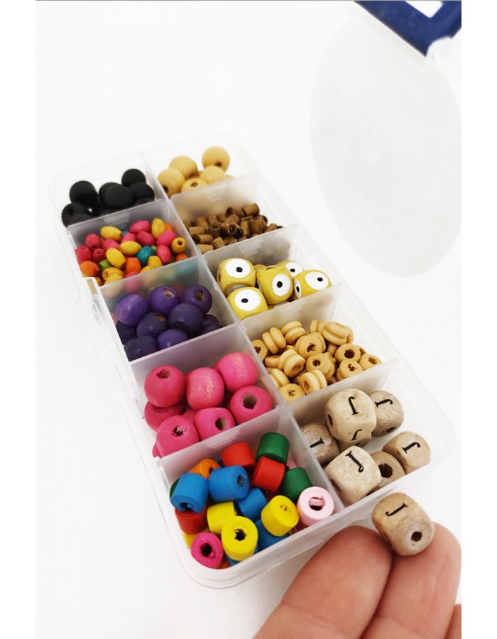Lajitelma eri muotoisia ja värisiä puuhelmiä, joiden halkaisijat vaihtelevat 4 - 10 mm välillä.