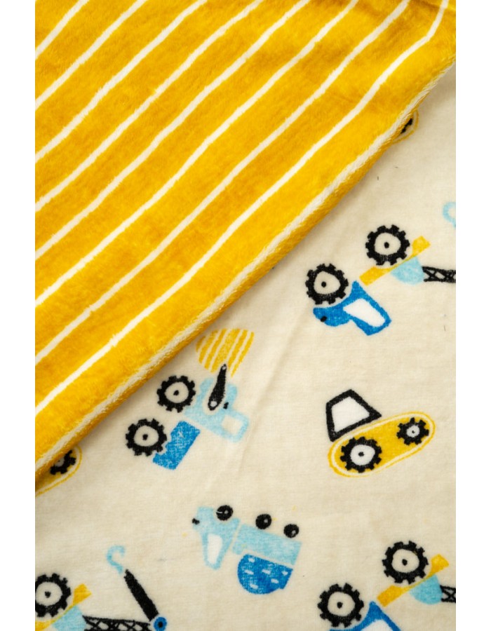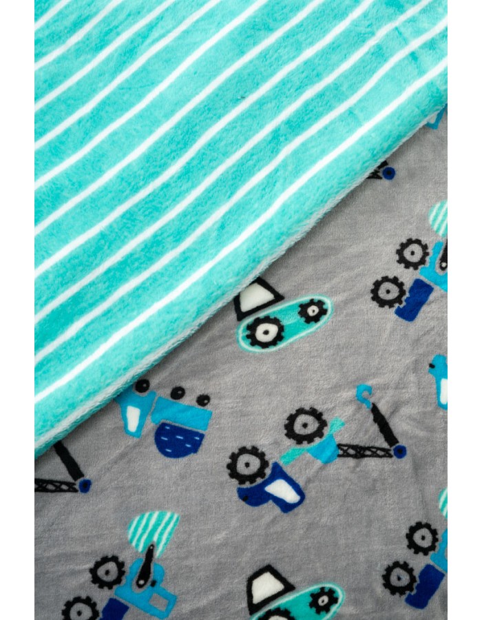 Kaksipuolinen fleece, jonka toisella puolella autokuvioita ja toisella raitoja.