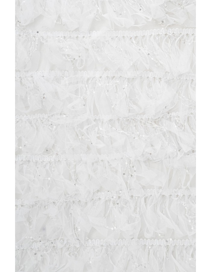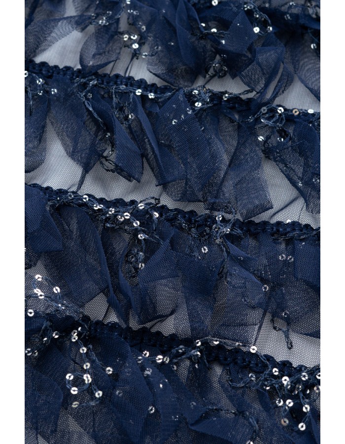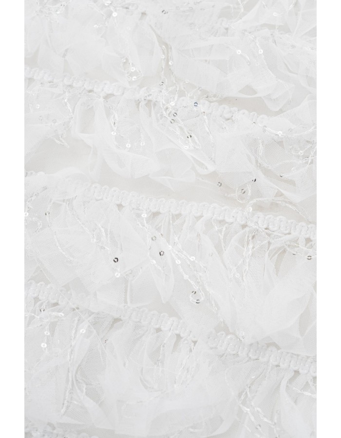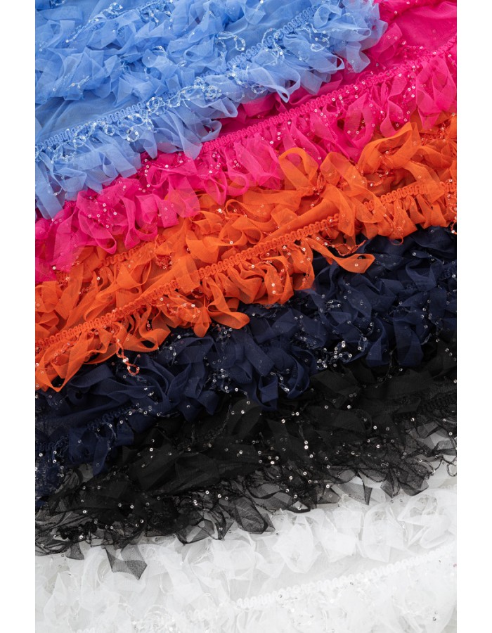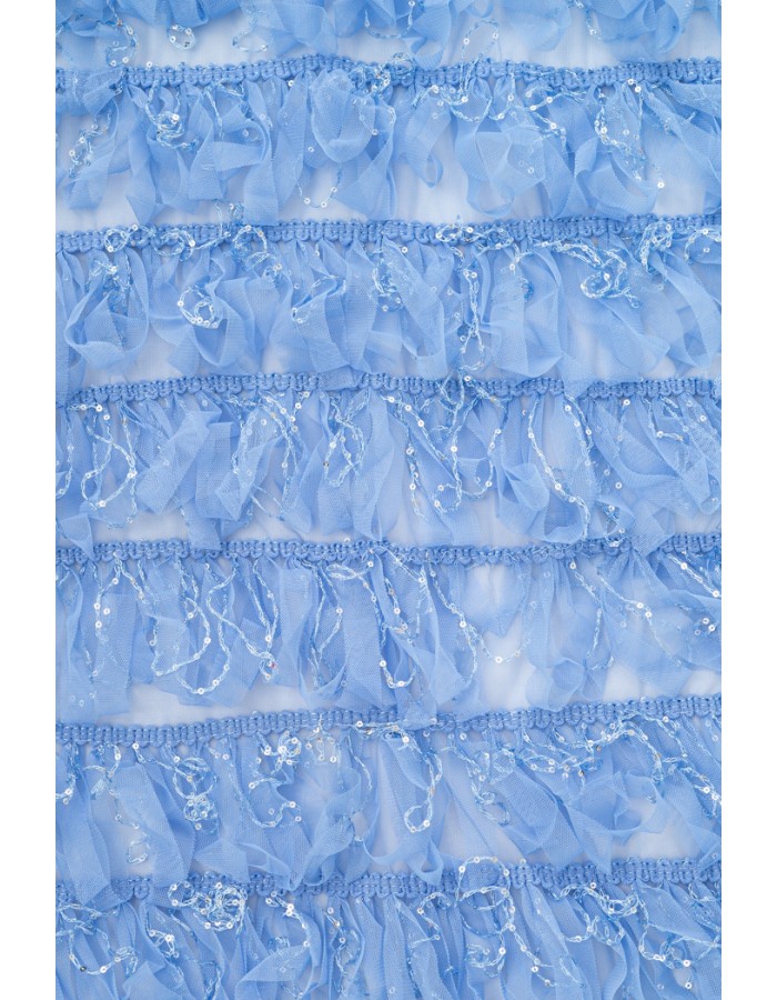 Pehmeä ohut tyllikangas, jota koristavat tylli- ja paljettilankalenkeistä muodostuvat hapsurivit. Muhkeat hapsurivit ovat pituudeltaan noin 8cm ja ne on ommeltu kankaaseen noin 7cm välein.