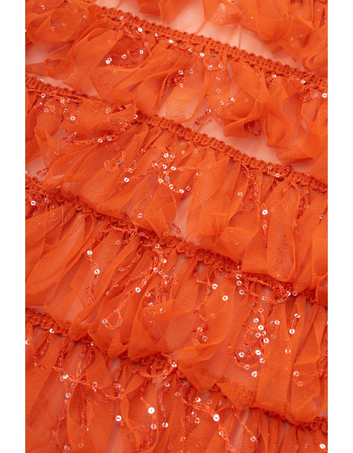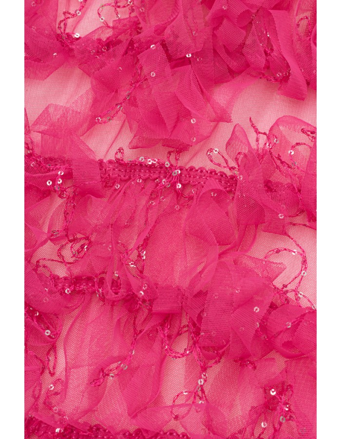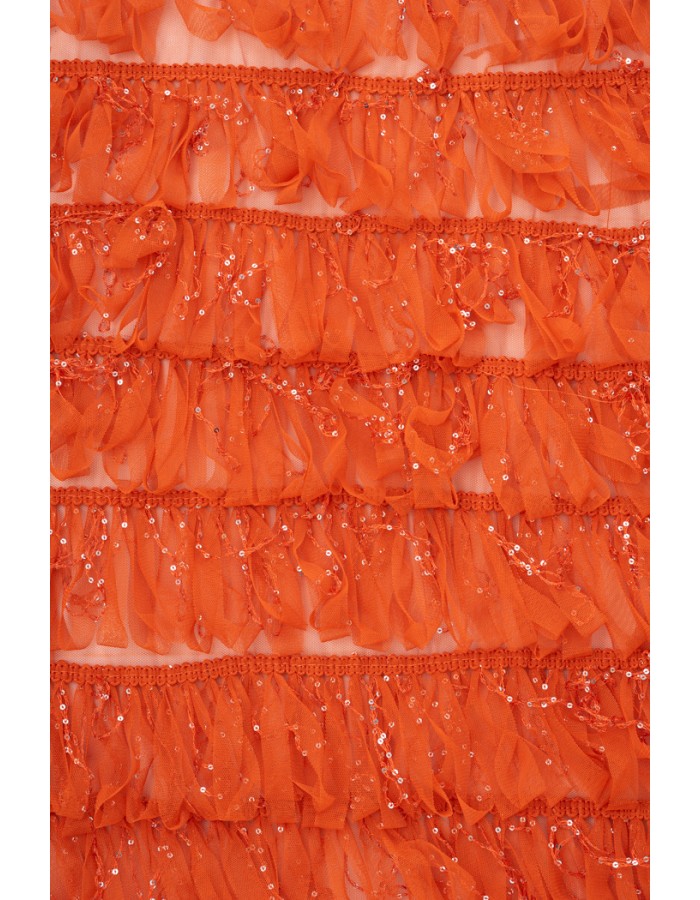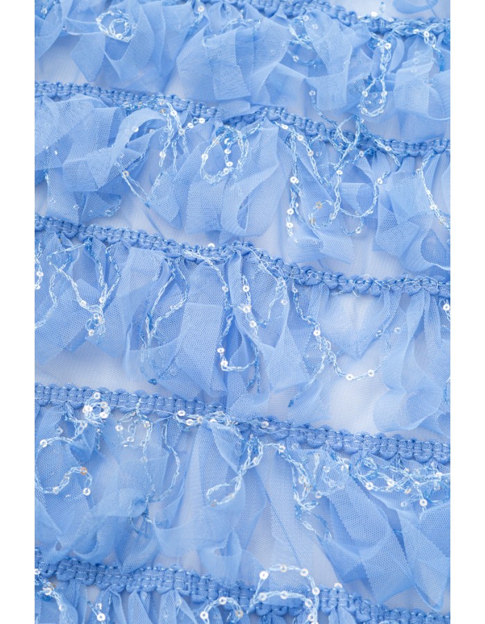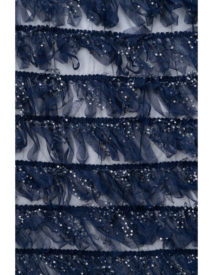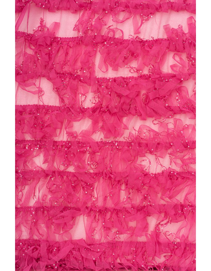 Pehmeä ohut tyllikangas, jota koristavat tylli- ja paljettilankalenkeistä muodostuvat hapsurivit. Muhkeat hapsurivit ovat pituudeltaan noin 8cm ja ne on ommeltu kankaaseen noin 7cm välein.